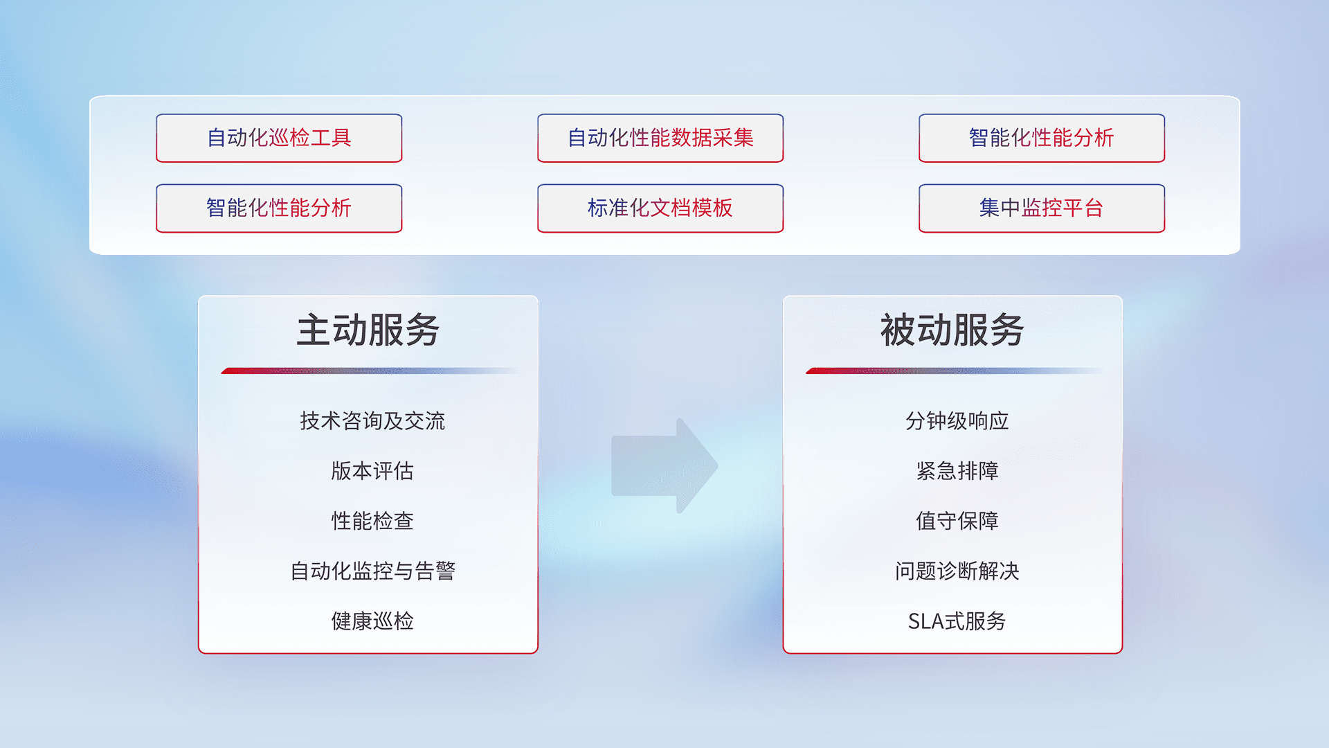 智能化工具和标准化文档,,,,保障服务质量,,提供主动服务(包含技术咨询、、、、版本评估、、、、性能检查、、、自动化监控与告警、、健康巡检)和被动服务包含(分钟级响应、、、紧急排障、、、、值守保障、、、问题诊断解决、、SLA服务)。。。。
